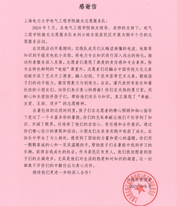 近年来,院微光志愿服务队组织大学生电力科普志愿服务队,充分发挥电气工程专业学科特色,以“传播电力知识,服务社会发展”为宗旨,打造集科普教育、公益服务、实践育人于一体的特色志愿服务品牌,架起专业知识与社会需求的桥梁。以“走出去”和“请进来”相结合,志愿者们走进社区、中小学等,提供“家门口”、“菜单式”电力科普服务,累计开展“电娃”小课堂200余次,输送优秀志愿者近500人,辐射2万余人次,服务时长超1.5万小时。受到上海市杨浦区团区委基层工作部等单位的肯定,获评团中央七彩假期关爱行动志愿服务项目、上海市青年志愿服务典型案例、杨浦区优秀志愿服务组织等。此外,志愿者将技术创新融入公益实践自主研发近电预警手环等科创项目,形成了专业知识与社会责任协同育人的生动案例。