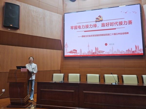 宣讲团指导老师张文文以《牢握电力接力棒,跑好时代接力赛》为题,以党的二十届三中全会精神为指引,以电力行业发展为主线,带领大家回顾从“开着火车送电”的艰苦岁月,到“世界工程”三峡水电站投产的壮丽图景,再到如今“戈壁滩上种太阳”的蓬勃时代。她强调,每一代电力人都秉持着“为人民供好电”的初心和“人民电业为人民”的能源情怀,书写着一代又一代的能源成就,跑好属于电力人的时代一棒。新时代的青年要把握国家能源安全、突破技术创新和绿色低碳转型的重要机遇,以实际行动推动国家能源事业的持续发展,为建设能源强国、推进中国式现代化贡献青春力量。