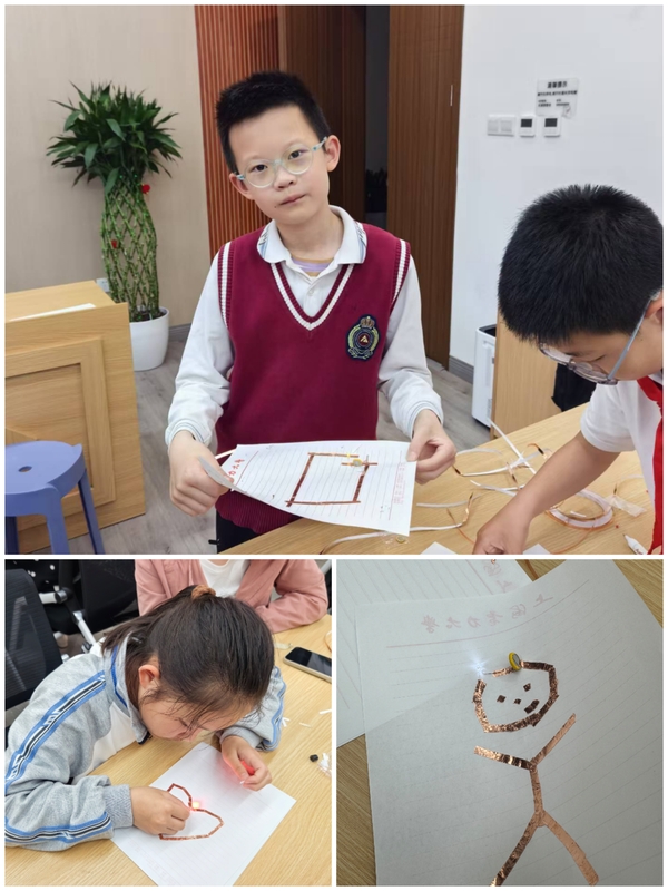 随后的实验环节,在志愿者的指导下,孩子们利用导电墨水笔和胶带,亲手制作了自己喜欢的图案,如星星、树木等。更令人惊喜的是,他们还通过蜂鸣器和LED灯的配合,赋予作品以动态光影效果。