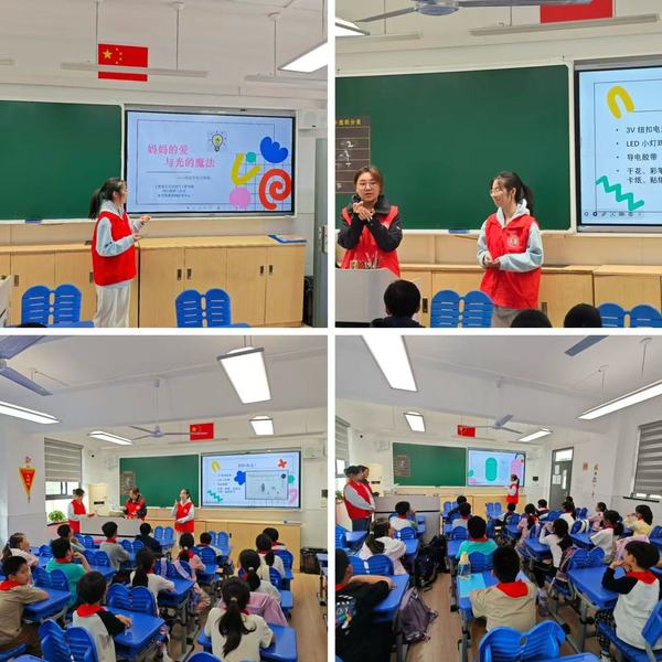 志愿者们还为小朋友们带来“点亮感恩之光”的小实验。小朋友们在志愿者的指导下亲手动手实验,为每位小朋友的妈妈制作了爱心贺卡,以此来向妈妈表达自己的感恩之情。志愿者们化身“魔法师”,发挥自己的专业知识与青春能量,将知识点融入引人入胜的故事,引导孩子们深刻感受母亲的伟大与节日背后承载的深厚情感。从图形设计到LED灯的连接,当一张张贺卡被成功点亮,孩子们脸上洋溢的自豪与喜悦,不仅是对自己作品的肯定,更是对志愿者们辛勤付出的最好的反馈。这份闪耀着“光的魔法”的礼物不仅仅是一堂知识普及课,更是志愿者们用心传递爱与敬意的生动实践。