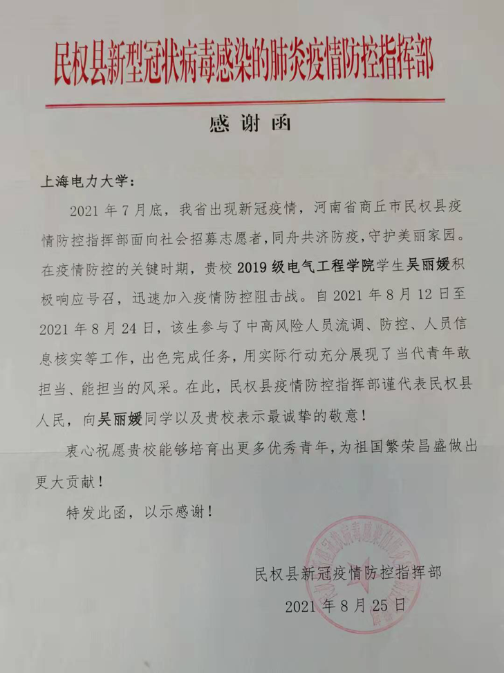 信中写道:2021年8月12日至2021年8月24日,吴丽媛参与了中高风险人员调流、防控、人员信息核实等工作,出色完成任务,用实际行动充分展示了当代青年敢担当、能担当的风采。信中也祝愿我校能培养出更多的优秀青年,为祖国的繁荣昌盛做出更大贡献!