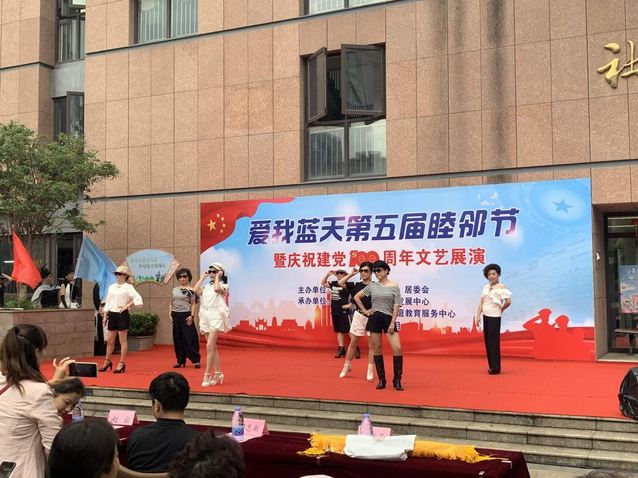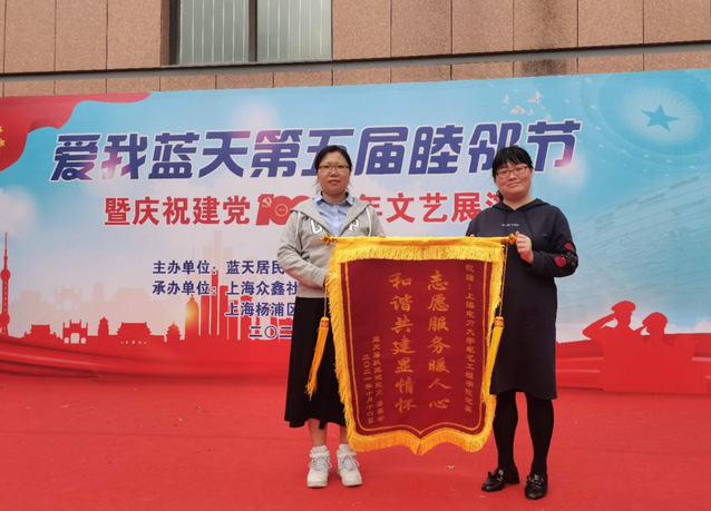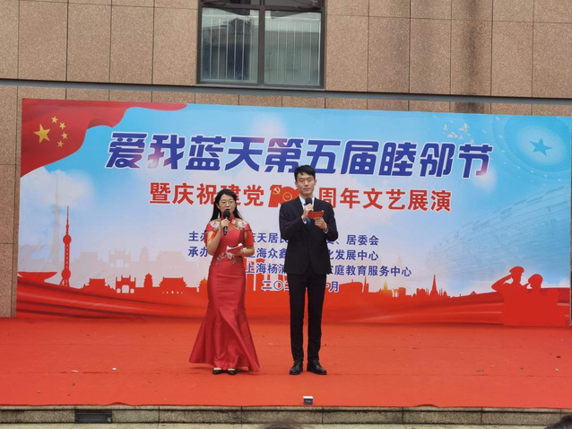 10月16日,蒙蒙细雨抵挡不住蓝天居民区军民载歌载舞、欢聚一堂的热情,一场由社区居民自编、自导、自演的“爱我蓝天”第五届睦邻节如期上演。演职人员由现役军人、退役军人、军属、大学生志愿者共同组成,活动既丰富了居民的精神文化生活,又增强了居民的幸福感和归属感,展现了党建引领下共建共治共享的社区发展新面貌。3044am永利集团3044noc学生代表张启胜和周育昕前往蓝天社区主持五角场街道蓝天居民区“爱我蓝天第五届睦邻节”文艺演出。3044am永利集团3044noc本科生第一党支部书记余开华参与授旗仪式,领取锦旗。
