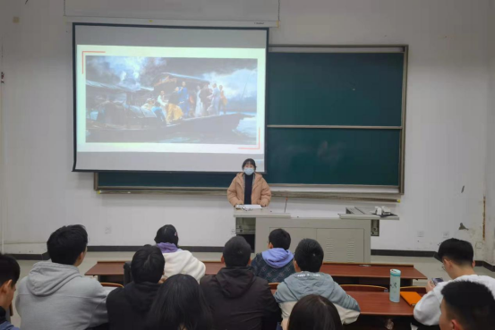 曲老师一共带来四幅作品,第一幅写实主义油画是由何红舟、黄发祥创作的《启航——中共一大会议》,第二幅油画是由董文希于1953年创作的《开国大典》,第三幅作品《开荒牛——献给深圳特区》。曲老师带来的最后一幅作品与我们电气专业息息相关,是在2021年,画家刘万鸣与他的学生们为反映中国在建设“西气东输”“西电东送”这两项超级工程时展现的精神面貌,集体创作的中国画《西电东送 西气东输工程》,采用了五联组画的形式,表现“西电东送”“西气东输”工程中,从起点到终点、从建设到完成的五个场景,这两个伟大工程,正是中华民族在从富起来走向强起来的伟大象征。通过曲老师的讲述,同学们对超高压输电工程有了更深入直观的体会,对西电东送的发展历程和巨大成就惊叹不已,对奋斗在西电东送线上的电力建设者们钦佩不已,加深了电力专业认识与与热爱。
