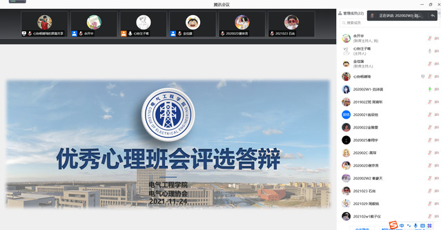 本次活动由心协成员金佳旗主持,介绍了此次答辩的流程及注意事项。随后各班负责人按照此前抽签顺序依次出场,通过PPT共享屏幕的形式向大家介绍开展背景,活动流程的详细描述,总结感悟,每人总时长控制在3~5分钟。介绍完成后,由老师辅导员和电气心协骨干成员组成的评选团向答辩者提出问题并展开交流分享,最后由余开华老师对本次班会进行总结发言。本次答辩共有15个班级参与,最终评选出五个“优秀心理班会”集体荣誉称号。在会议的最后留下了一张大家的合照作为纪念。