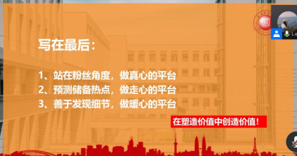 徐仙君着重强调了推送的制作运营要有实际意义、围绕学院工作并不断地进行调整内容以适应同学们的实际需求,并以地缘、榜样、情怀、风口、议题设置、读图六个选题关键词,并辅以实际推送案例进行具体讲解,给出了“一个中心、多点辐射,紧密合作,建立资源共享平台”的建议。新媒体建设应做到“真心、走心、暖心”,要及时预测储备热点,善于发现校园生活的细节,鼓励同学们在塑造价值中创造价值。