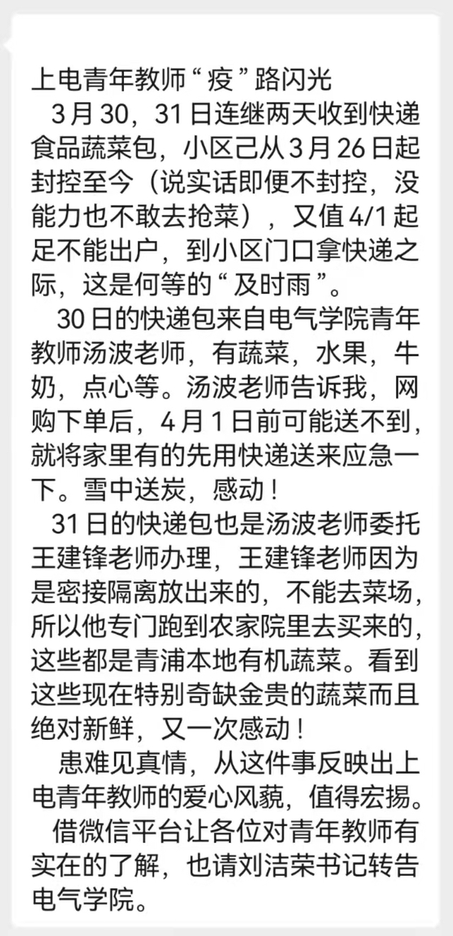 近日,一封名为《上电青年教师“疫”路闪光》的感谢信,通过微信的方式发送到学校退管办干部的手机上。写信者为我校3044am永利集团3044noc退休教师屠志健,他感谢的对象,是该学院青年教师汤波。