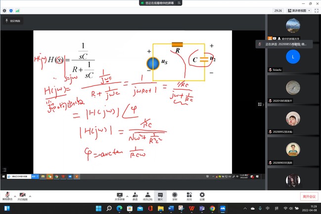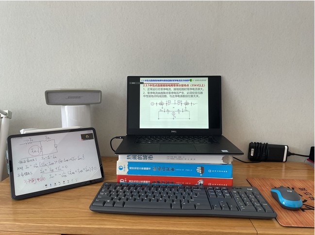季亮老师通过笔记本电脑、平板电脑和电子笔开展教学,在讲解的过程中利用白板和PPT双重模式,以腾讯会议方式共享PPT,重要公式推导通过平板电脑在线讲解。板书完成后,让课程代表进行截屏,发送到课程微信群中,学生下载并保留板书内容。