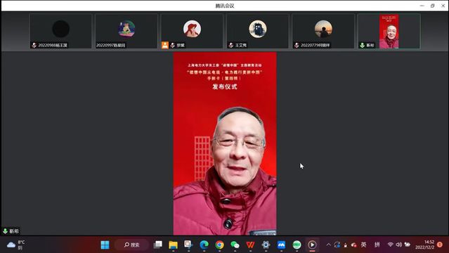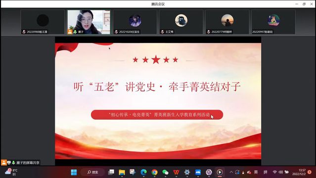 12月2日下午,3044am永利集团3044noc“初心传承·电亮菁英”菁英班新生入学教育系列活动之听“五老”讲党史•牵手菁英结对子在腾讯会议线上展开。学院关工委一号老同志靳希教授及全体2022级菁英班同学参加,辅导员罗黛主持会议。
