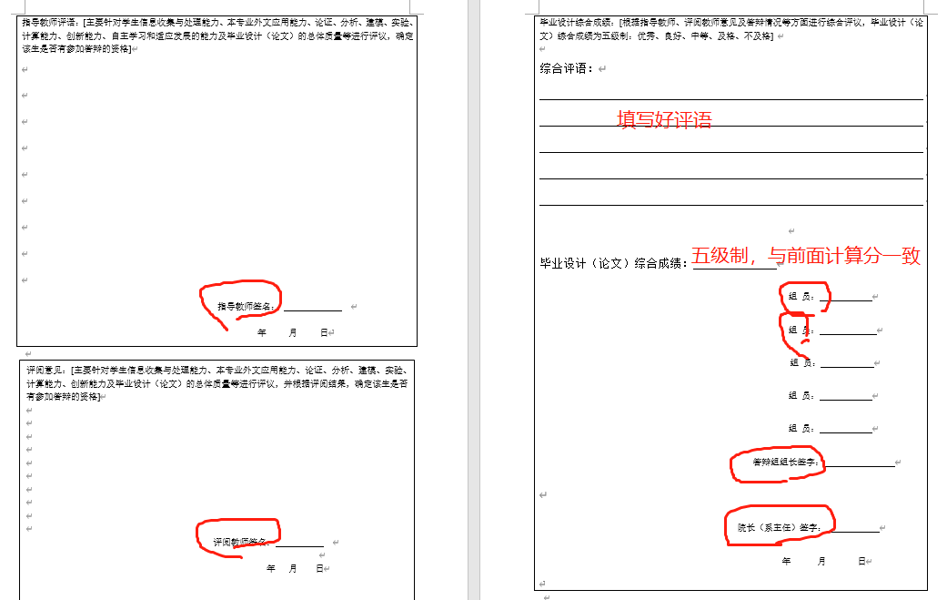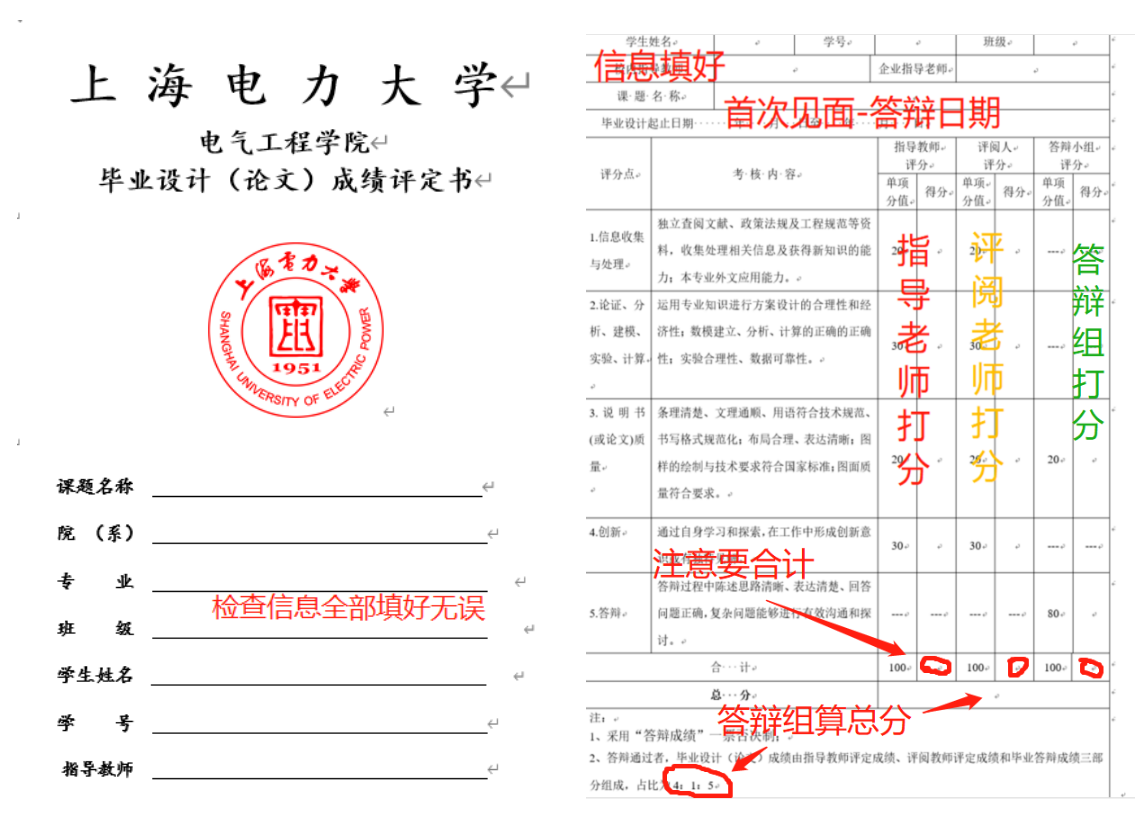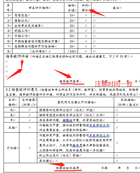 ◆答辩组负责“资料目录”中的7~9项,检查成绩评定分数和所有签字签章处是否都齐全。