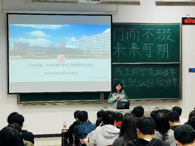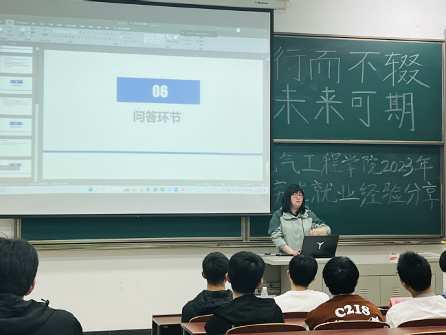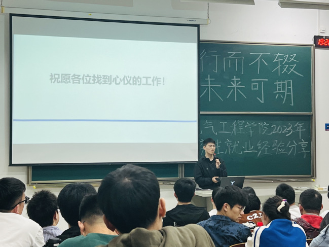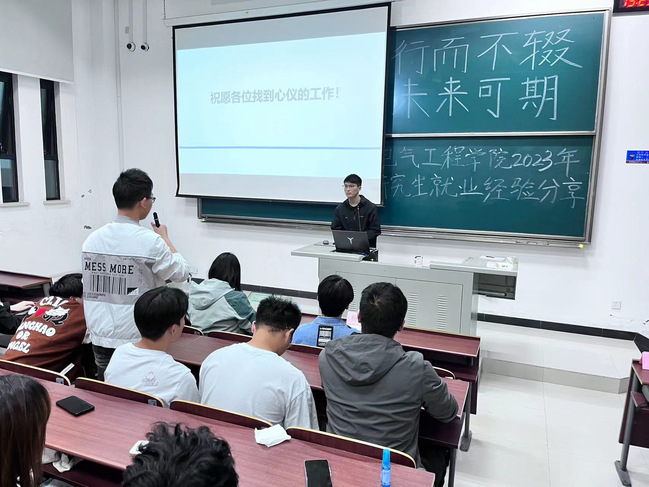 在就业经验分享环节,2023届研究生毕业生中签约国家电网、南方电网的杨云轶、陈雨潇、汤洪高、杨鹏、曹士鹏、黄栋铧六位同学详细介绍了各省份电网公司招聘的具体情况,分享了自身的招聘经历及求职心得。