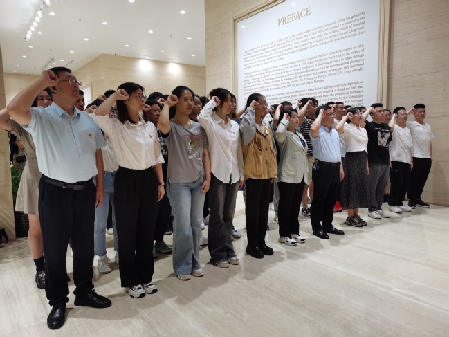 在纪念馆内,新发展的党员在学院党委副书记叶华刚的带领下进行了入党宣誓。他们肃立在鲜艳的党旗前,右手高举,庄重而坚定地宣誓,表示要永远践行党的宗旨,为人民利益奋斗终身。最后,全体党员在中共一大纪念馆的序厅集体合照留念,圆满结束此次参观学习活动。