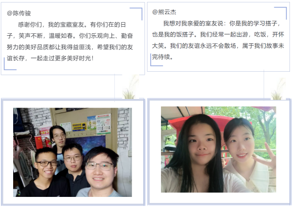 室友图鉴——“嗨!我的宝藏室友!”征集。一群来自五湖四海的室友们在大学寝室相遇,共度春秋,共盼寒暑。学院开展了“嗨!我的宝藏室友!”征集展示活动,向朝夕相处的室友们打声招呼。活动一经发布,电气学子踊跃投稿,学院经过筛选,整理成优秀寄语合集在学院官微上电电气进行展示。