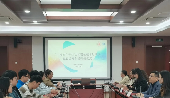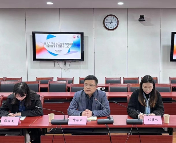 叶华刚介绍了学校“一站式”学生社区综合管理模式建设及安全月活动的情况,介绍了学院在大学生安全教育管理的工作机制及做法,明确了安全员的工作职责。希望受聘的安全员同学在日常工作中发挥好安全员、宣传员及信息员的作用,学生干部形成合力,配合辅导员老师做好班级安全工作。叶华刚通过生动的案例为与会学生干部作安全教育,启示班干部在防诈骗、宿舍安全、心理健康教育等安全工作中要发挥“头雁”作用,将学院的各项安全工作要求及时在班级落实,共同做好班级安全工作。