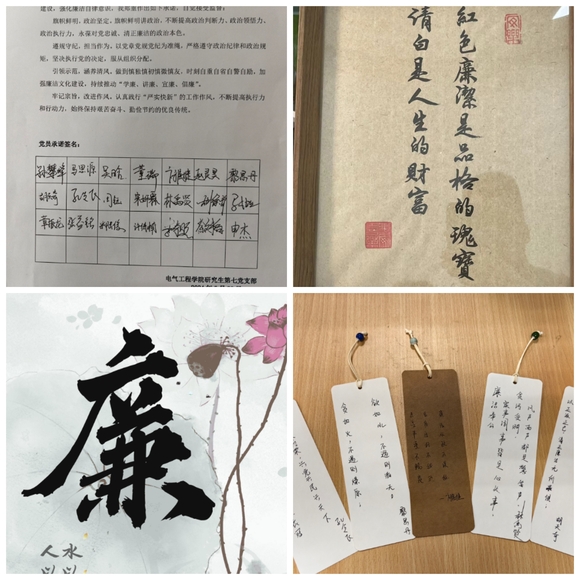 展示廉洁文化学习成果。党支部号召党员同志通过聚焦“廉洁治学、廉洁修身”,开展了廉洁文化学习活动。廉洁海报设计活动,以多样的角度展现党纪严肃性,用独特的方式表达条规权威性,海报主题突出、图文并茂,能够有效提升党员同志学习的积极性和主动性。此外,支部还组织开展了廉洁书签制作、廉洁书法作品展示,号召党员同志争创“廉洁先锋”形象代言人,落实廉洁文化工作要求,展示廉洁文化学习成果。