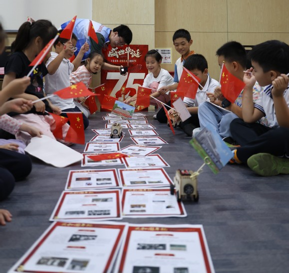 伴随着《歌唱祖国》的旋律,支部成员引导小朋友们将制作好的电动小车沿着精心铺设的轨道,从“1949年”缓缓驶向“2024年”。这一寓意深远的互动环节,使小朋友们在时光的交织中,深刻感受到新中国成立75年来的伟大历程,用心灵感受祖国发展之路的艰辛与辉煌。