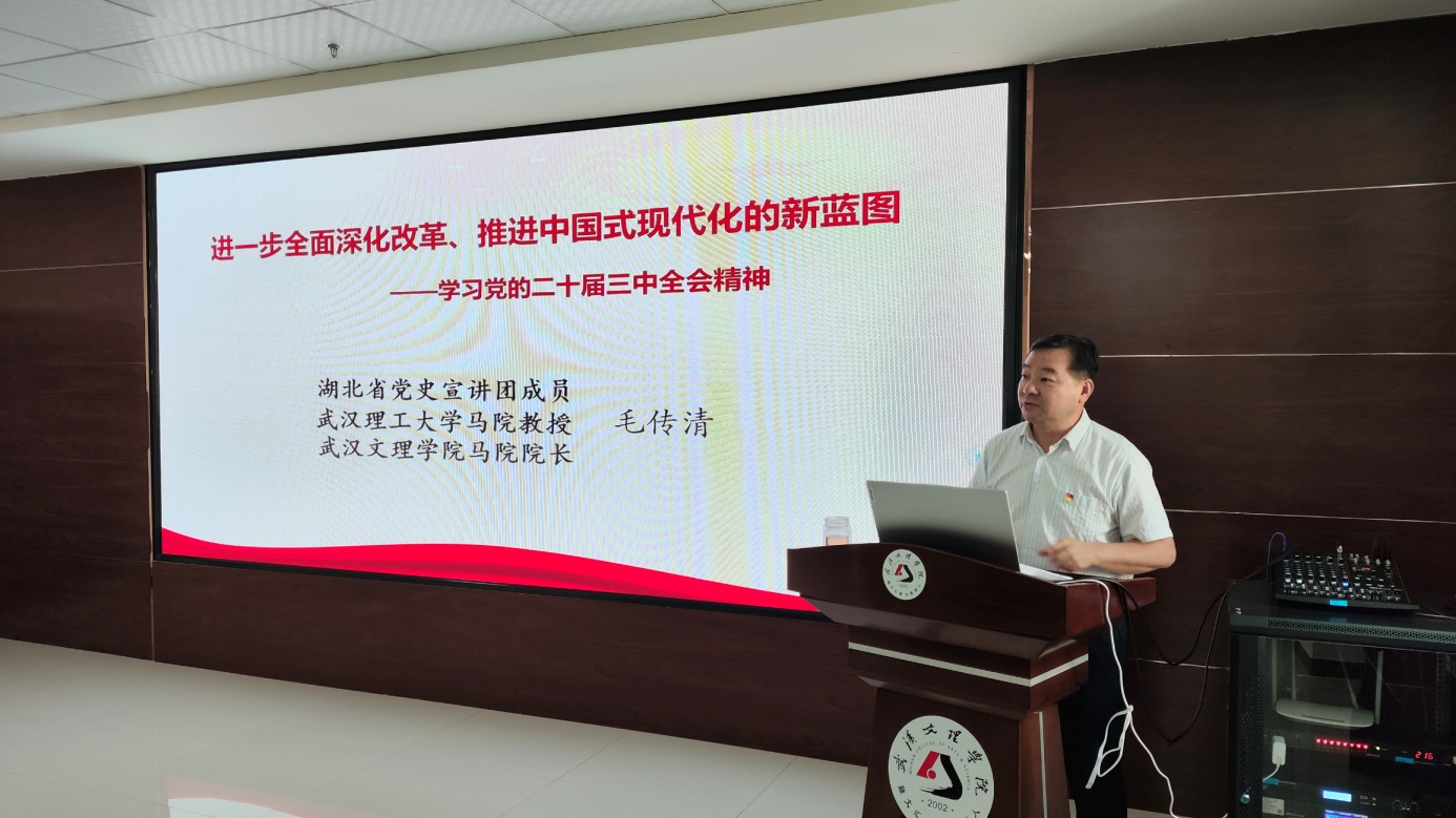学院院长毛传清作领学重点发言。他以《进一步全面深化改革,推进中国式现代化》为题,从改革成为历届三中全会的主题、党的二十届三中全会的重大意义、中国式现代化对进一步全面深化改革提出新要求、进一步全面深化改革的总体思路和系统部署、进一步全面深化经济体制改革的重点方面等五个方面做了专题解读。他提到,此次全会是在新时代新征程上,中国共产党坚定不移高举改革开放旗帜、紧紧围绕推进中国式现代化进一步全面深化改革召开的一次十分重要的会议,承载着深远的国家战略考量。在当前科技革命迅猛发展的重要战略机遇期,我们必须适应时代变化和需求,不断开创中国式现代化新局面。他还解读了构建高水平社会主义市场经济体制、建设更高水平开放型经济新体制、推进教育科技人才体制机制一体改革、坚持党的领导等重点内容。