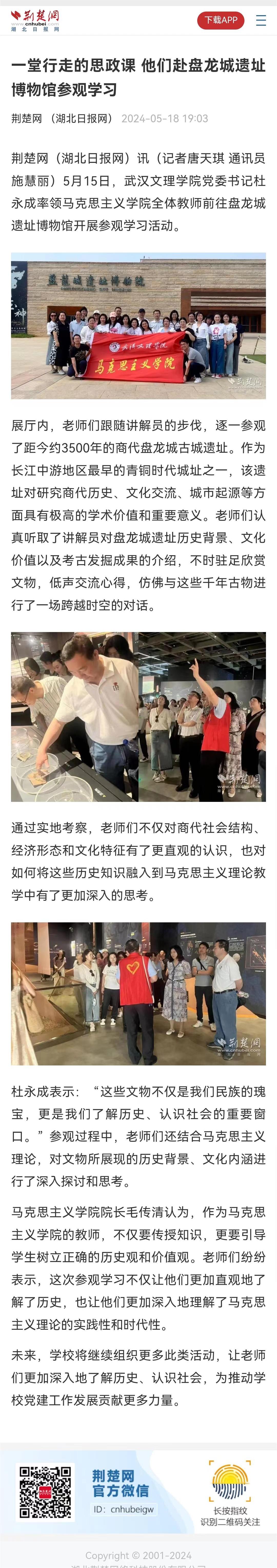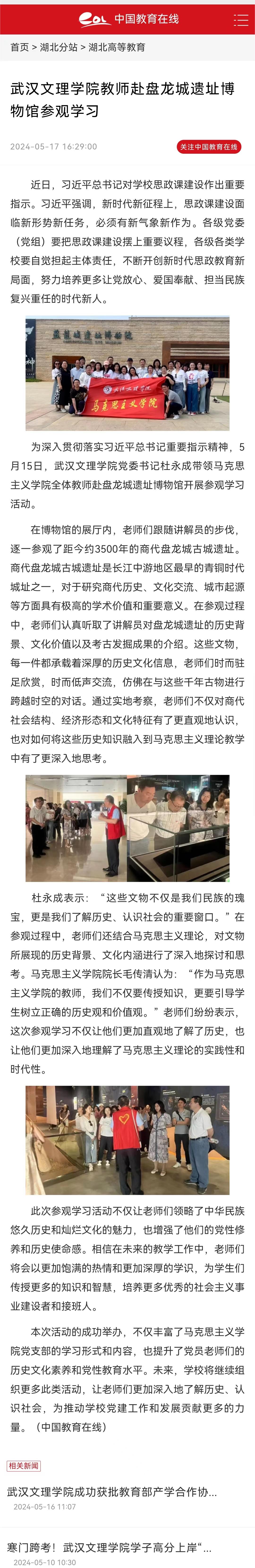 5月15日,mile米乐集团官网党委书记杜永成率领mile米乐集团官网全体教师前往盘龙城遗址博物馆开展参观学习活动。荆楚网(湖北日报网)、中国教育在线等媒体进行报道。以下为相关报道内容。